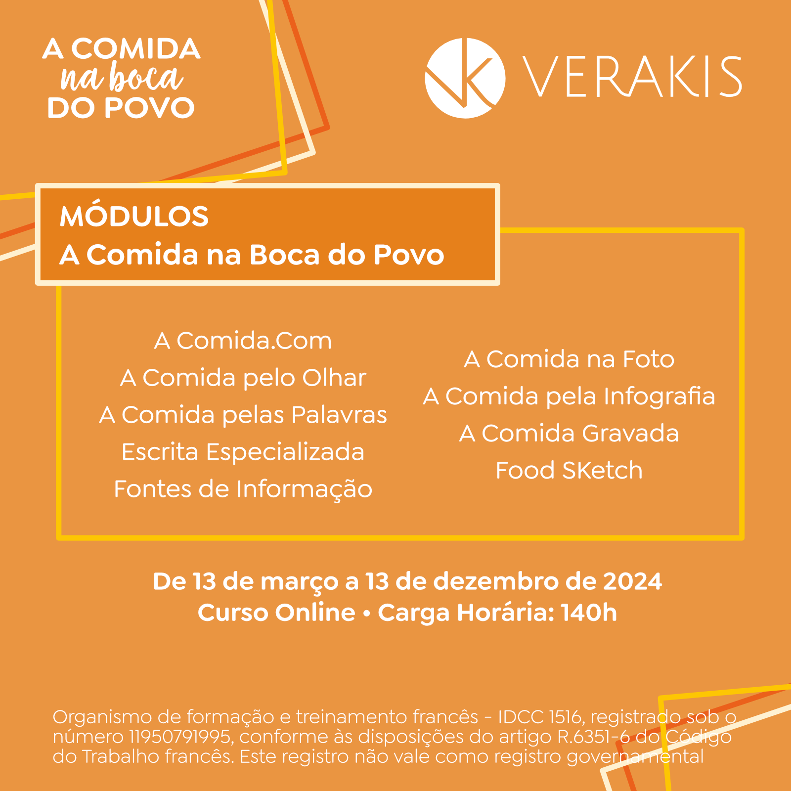 O curso A Comida na Boca do Povo é uma capacitação em informação e comunicação sobre alimentos, alimentação e nutrição, certificada na França através da Verakis Food Academy.